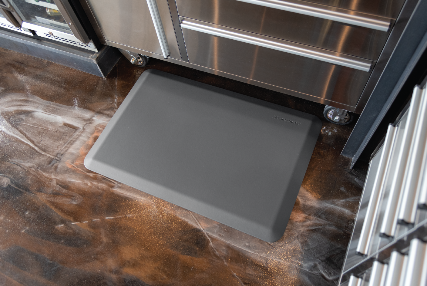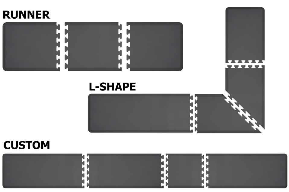 Our Puzzle system allows you to dictate the length, width, and shape to create a custom Premium Standing Solution. The interlocking “puzzle” edges provide effortless assembly and can be easily dismantled for moving and cleaning. Available in standard Runner sizes, L-Shape configurations, or Fully Custom shapes and sizes. Available in Grey or Black.